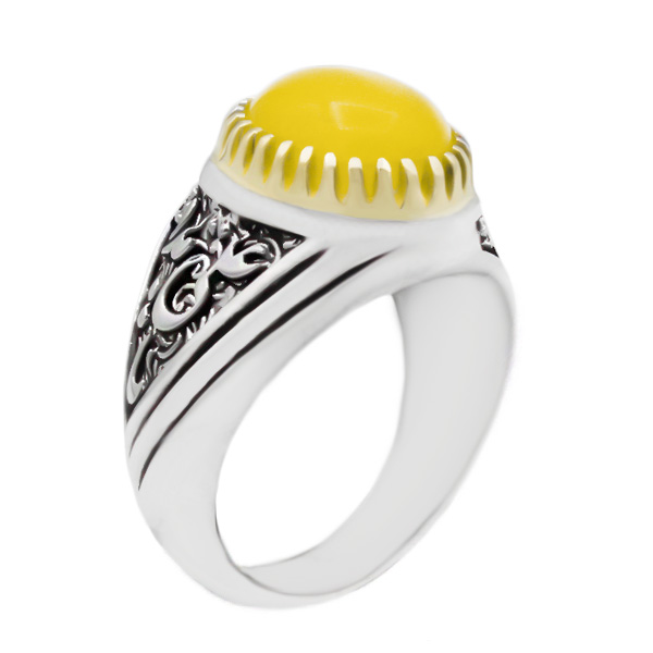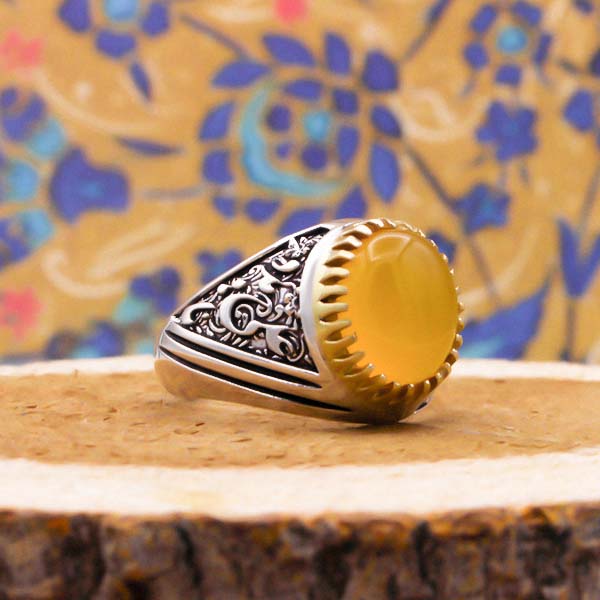 طرح برجسته یا علی (ع) مدد موجود بر بازو های این رکاب زیبایی، خاص بودن و ارزش معنوی به این انگشتر بخشیده است. طرح یا علی مدد با سیاه قلمی که دارد برجستگی مناسبی به نقش و نگار آن داده است. چنگ های طلایی رنگ این انگشتر از جنس برنج بوده و با گذشت زمان هرگز تغییر رنگ نمی دهد و مانع شرعی نیز برای استفاده آقایان ندارد. نگین این انگشتر عقیق زرد اصل و معدنی بوده و دارای کیفیت بسیار بالایی است. جنس انگشتر نیز از نقره با عیار ۹۲۵ بوده و قابلیت سایز شدن برای هر سایز انگشتی را دارد. قیمت مناسب، طراحی برجسته رکاب و اصالت سنگ شرف الشمس معدنی ویژگی های اصلی این محصول می باشند (حکاکی پر فضیلت شرف الشمس در زمان مقرر با رعایت آداب).