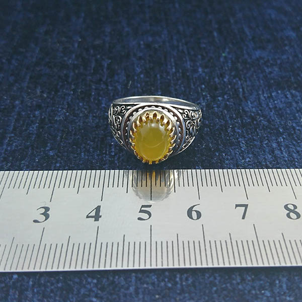 انگشتر نقره مردانه طرح منقش یا محمد از نقره با عیار ۹۲۵ ساخته شده است. روی رکاب این انگشتر طرح های مختلف و بسیار زیبایی به چشم می‌خورد که کلمه “یا محمد”با زیبایی و طرح منحصر به فردی در میان آن قرار گرفته است. نگین این انگشتر عقیق شرف شمس اصل و معدنی است که به صورت بیضی شکل می‌باشد و سطح صاف آن در کنار چنگ های ظریف و طلایی رنگ این طرح زیبایی خیره کننده ای به آن بخشیده است. انگشتر نقره مردانه با طرح یا محمد در اندازه های مختلف قابل سایز شدن است