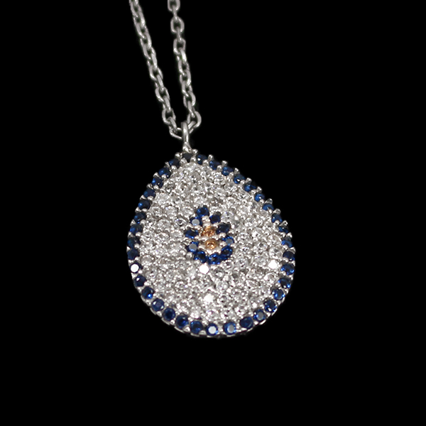 گردنبند نقره دخترانه و زنانه طرح فانتزی اشک از نقره عیار ۹۲۵ ساخته شده است. این رکاب به کمک نگین های ریز اتمی به طوری تزئین شده است که تقریبا هیچ برآمدگیای روی محصول وجود ندارد و همه نقش و نگاره ها و نگین های ریز درون حفره هایی از فریم قرار گرفته است تا جذابیت محصول چندین برابر گردد. این نگین ها با چینشی دقیق طوری طراحی شدهاند که به شکل یک قطره اشک درآمدهاند. دور تا دور این محصول نگین های اتمی آبی و درون آن نگین های نقرهای رنگ کار شده است در مرکز این فریم نیز چندین نگین آبی در کنار هم نقشی جذاب ساختهاند که طراحی بینظیر آن را تکمیل میکند. این رکاب دارای آبکاری رادیوم است که سبب دوام بیشتر در درخشندگی میگردد و آن را در برابر سیاه شدن مقاوم میسازد.