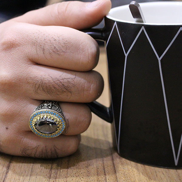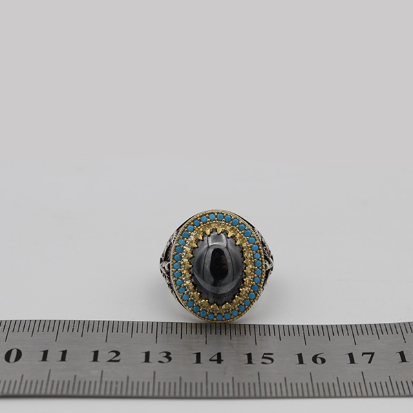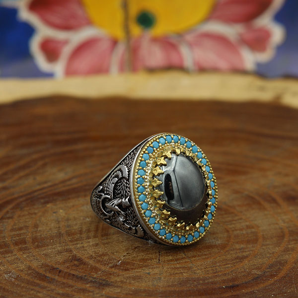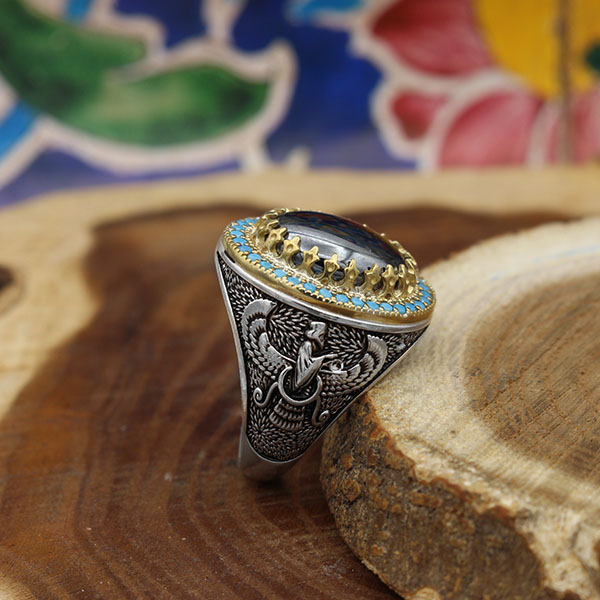 یک انگشتر خاص و متفاوت که طراحی تاریخی و مذهبی را با زیبایی مدرن ترکیب کرده است. سنگ حدید صینی اصل و حکاکی ذکرهای معنوی، این انگشتر را به یک انتخاب منحصر‌به‌فرد تبدیل می‌کند. این انگشتر برای هر سایز انگشتی قابل سایزشدن می باشد. در اطراف نگین حدید صینی شما چندین نگین اتمی آبی رنگ را مشاهده می‌کنید که جلوه‌ای خاص و جوان‌پسند به این انگشتر داده است. بخش‌های طلایی رنگ انگشتر نیز از جنس برنج بوده که با گذشت زمان تغییر رنگ نخواهد داد.