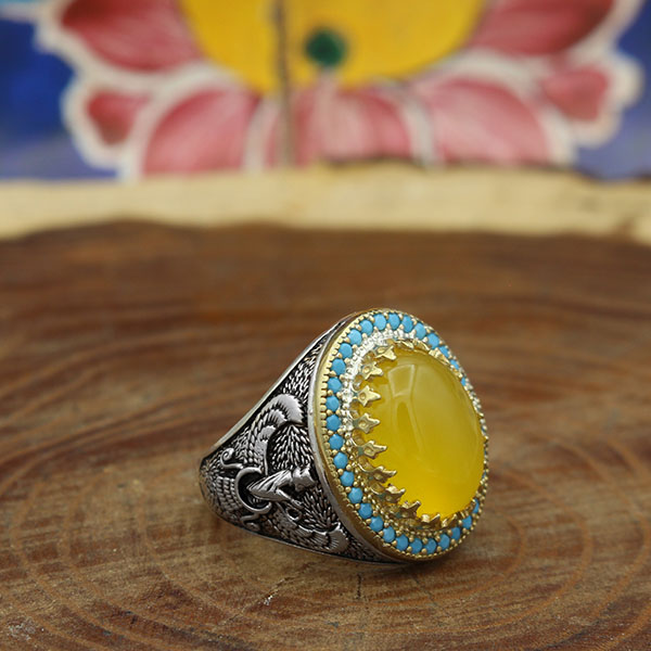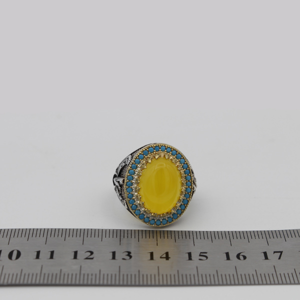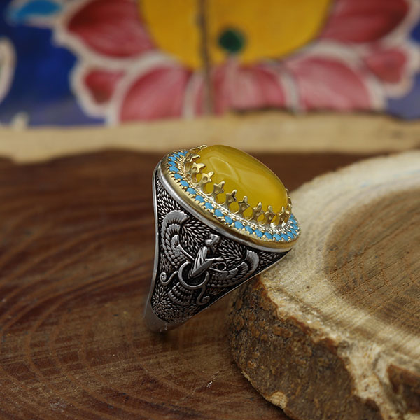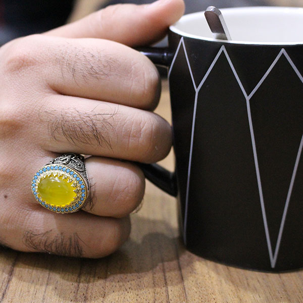 یک انگشتر خاص با نگین عقیق زرد معدنی که با حکاکی دعای شرف الشمس، جذابیت و خواص معنوی آن دوچندان شده است. قابلیت تغییر سایز، آن را به گزینهای مناسب برای هر سایز انگشتی تبدیل کرده است. نگینهای اتمی آبی رنگ کار شده در اطراف نگین عقیق زرد، سمفونی رنگها را به رخ هر بینندهای نشان میدهد. بخشهای طلایی رنگ این انگشتر از جنس برنج بوده و به هیچ عنوان تغییر رنگ نخواهد داد. جنس نگین این انگشتر عقیق شرف الشمس است که در کتب اسلامی برای آن خواص زیادی عنوان شده است (حکاکی ذکر پر فضیلت شرف شمس در پشت نگین با آداب معین و در زمان خاص).