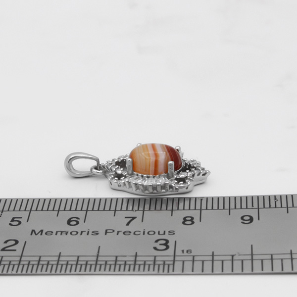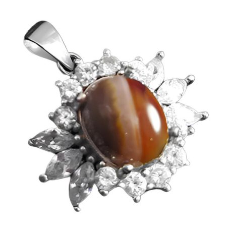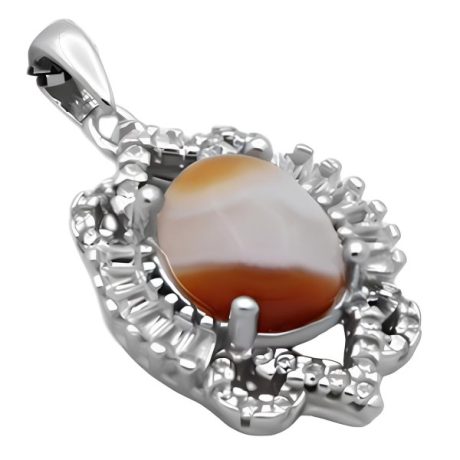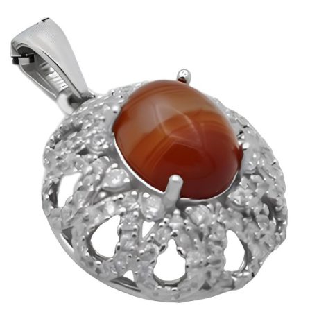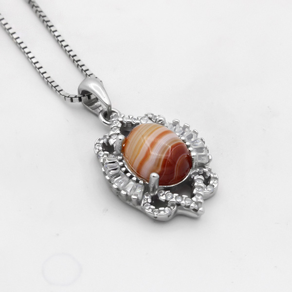 گردنبند عقیق سلیمانی نقره زنانه طرح دلسا ۲ از نقره ۹۲۵ عیار ساخته شده است . استفاده از نگین های ریز اتمی به جذابیت و درخشش محصول افزوده است و طراحی فریم گردنبند بدون کوچک ترین ایراد و کاملا متقارن است. طراحی خاص و منحصر به فرد رکاب نقش چشم گیری در افزایش جذابیت محصول دارد که با یک لایه آبکاری رادیوم صورت گرفته بر روی آن در برابر هرگونه ماده شیمیایی و یا سایش و خراش از مقاومت قابل قبولی برخوردار شده است و در استفاده طولانی مدت کدر نمی شود. جنس نگین سنگ عقیق سلیمانی اصل و معدنی بوده که علاوه بر ترکیب رنگ قهوه ای و لایه لایه کمیاب و دارای حالتی شبیه به چشم دارای خواص معنوی بسیاری است. توجه داشته باشید قیمت گردنبند بدون در نظر گرفتن قیمت زنجیر محاسبه شده است.
