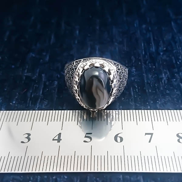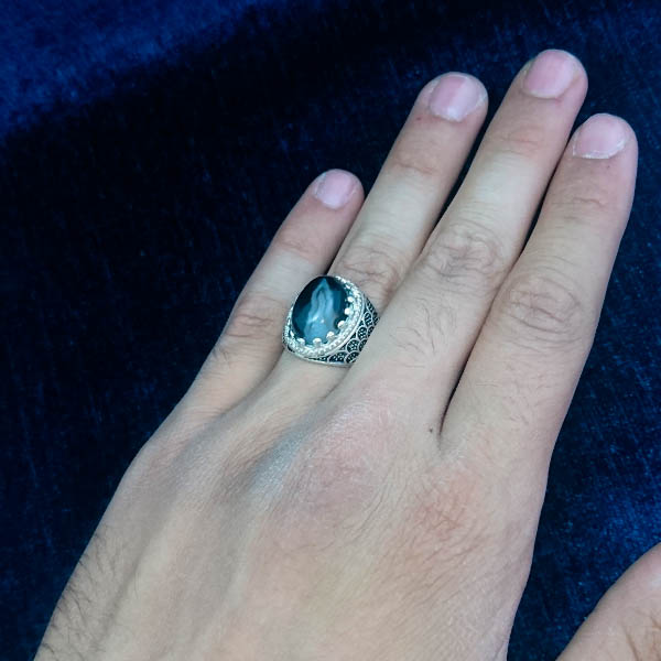 انگشتر نقره مردانه طرح صدفی سیاه قلم با سنگ عقیق سلیمانی