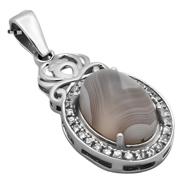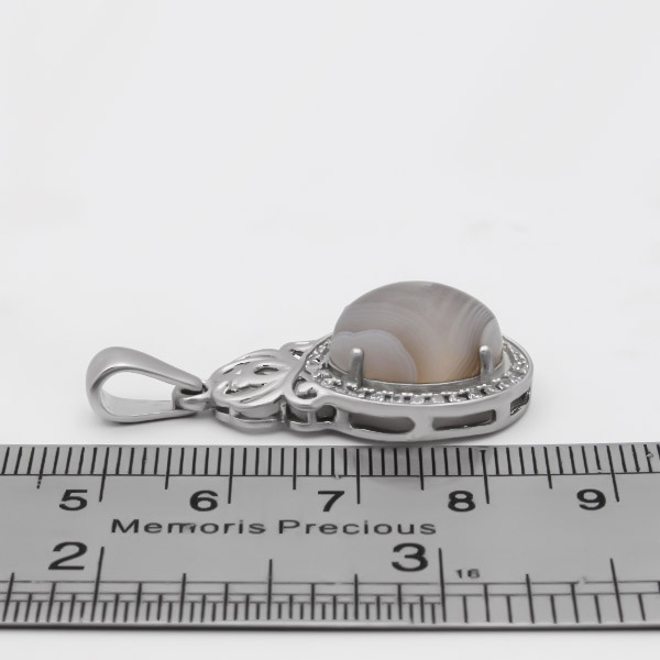 گردنبند عقیق سلیمانی طرح شادی از نقره ۹۲۵ عیار ساخته شده است. این محصول دارای نگینی جذاب و منحصر به فرد است که یکی از انواع عقیق می باشد و خواص معنوی بسیار و همچنین زیبایی ظاهری زیادی را دارد و در آن تلفیقی از رنگ های خاکستری و سفید مشاهده می گردد. فریم این گردنبند دارای آبکاری رادیوم می باشد که درخشش و جلای نقره را می افزاید و مانع تیرگی و تغییر رنگ آن می گردد. دور تا دور این گردنبند با نگین های ریز اتمی تزئین شده و درخشنده و جذاب است. توجه داشته باشید قیمت این گردنبند بدون در نظر گرفتن قیمت زنجیر محسوب شده است.