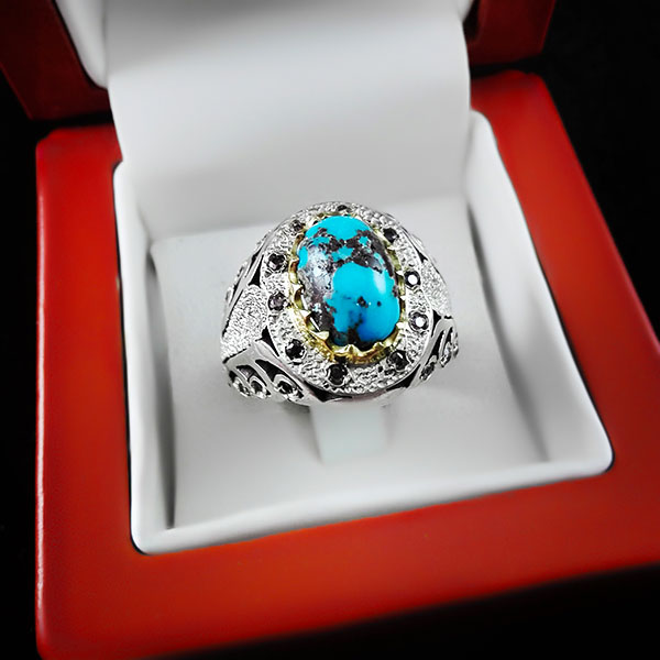 انگشتر فیروزه نیشابوری نقره دست ساز فاخر مردانه طرح دور طلایی هرمان