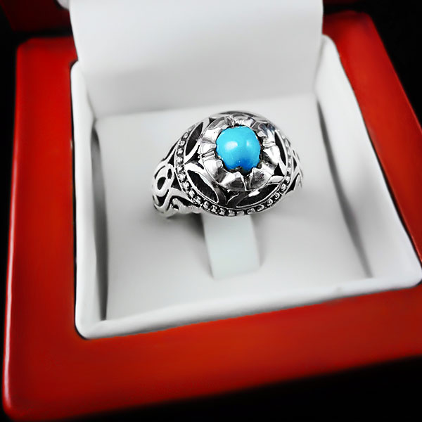 انگشتر فیروزه نیشابوری مردانه طرح رفیع از نقره ۹۲۵ عیار و توسط دست انگشترسازان هنرمند ساخته شده است. رکاب انگشتر دارای طرح های شبکه ظریف است که جذابیت چشم نوازی به آن بخشیده است. همچنین این رکاب دارای طرح های شبکه سازی و نگاره های منحصر به فرد می باشد که با دقت بالا انجام شده و به وضوح در دو طرف رکاب مشاهده می گردد. جنس نگین سنگ فیروزه نیشابوری اصل و معدنی بوده که به صورت کاملا متقارن و گنبدی شکل برش خورده و بادوام و کیفیت بالا روی رکاب سوار شده است. چند رگه اطراف نگین مشاهده می گردد که اصالت نگین را تضمین می کند و جذابیت و زیبایی نگین را به شکل قابل توجهی افزایش داده است. سنگ فیروزه از جمله سنگ های با ارزش شمرده می شود و از خواص و تاثیرات معنوی بسیاری برخوردار است که از جانب امام صادق (ع) نیز توصیه شده است.
