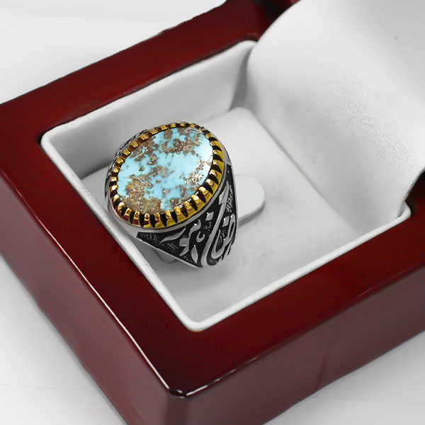انگشتر فیروزه نیشابوری مردانه طرح یا ضامن آهو (ع) دارای رکابی جذاب است. این رکاب از نقره ۹۲۵ عیار ساخته شده است. قسمت طلایی رنگ و چنگ انگشتر از برنج ساخته شده و تغییر رنگ نمی‌دهد و همراه آبی نگین و نقره ای رکاب ترکیب رنگی جذاب ایجاد کرده است. جنس نگین سنگ فیروزه نیشابوری اصل و معدنی است و رنگی آبی و منحصر به فرد دارد و سطحی صاف دارد. فیروزه یکی از محبوب ترین سنگ هاست و از جانب امام صادق (ع) نیز توصیه شده است. این انگشتر قابلیت سایز شدن برای هر سایز انگشتی را دارد.