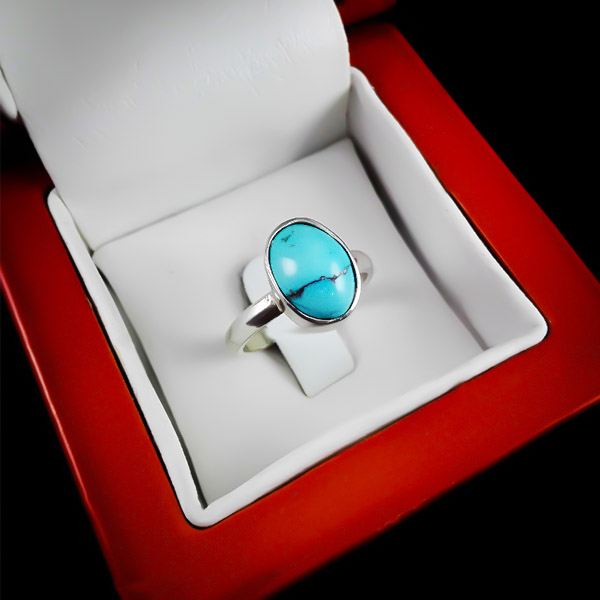 انگشتر فیروزه نیشابوری طرح ژالان از نقره ۹۲۵ عیار ساخته شده است. نگین انگشتر سنگ فیروزه نیشابوری اصل و معدنی میباشد که خواص معنوی بسیاری را داراست و رنگی منحصر به فرد دارد و چند رگه جذاب و مشکی روی آن مشاهده می شود که نقش نگین را افزوده و ضمانتی برای اصالت آن است. همچنین این انگشتر در قسمت پشت نگین حرز امام جواد (ع) و تربت امام حسین (ع) را نیز داراست. جنس رکاب نقره عیار ۹۲۵ بوده و به خوبی و با دقت بالا صیقل خورده و ساده و درخشنده است. این انگشتر قابلیت سایز شدن برای هر سایز انگشتی را دارد.