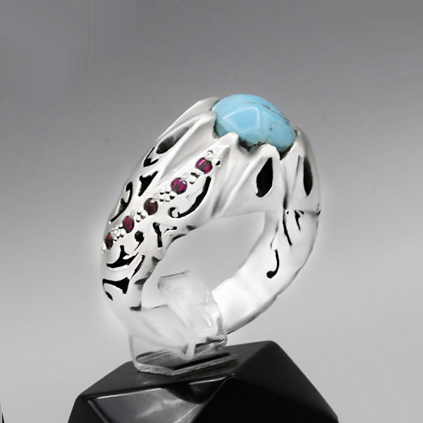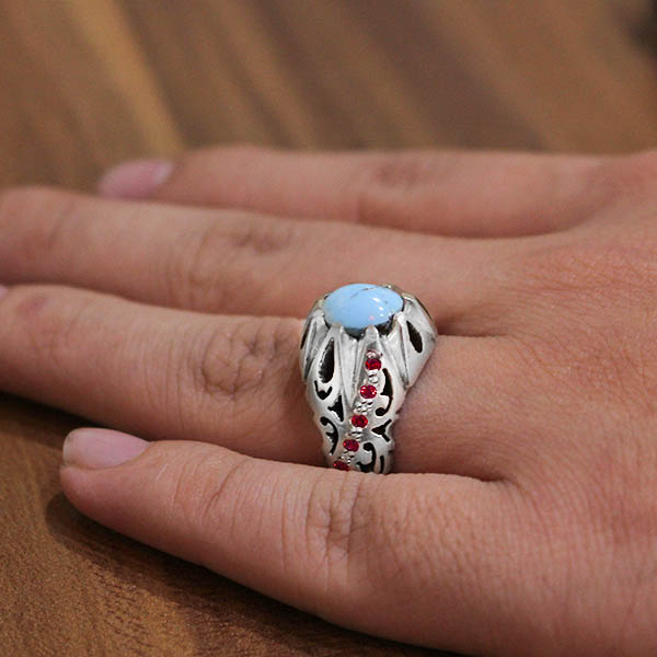 انگشتر فیروزه نیشابوری طرح آرین از نقره با عیار حداقل ۹۲۵ و توسط دست هنرمندان انگشتر سازی ساخته شده است. بازو های این انگشتر دارای شبکه زنی خاصی که بصورت متقارن و دقیق روی انگشتر انجام شده است. روی رکاب در هر طرف ۵ نگین سرخ و زیبا مخراج کاری شده است که جذابیت محصول را افزوده است. جنس نگین سنگ فیروزه نیشابوری اصل و معدنی بوده که به صورت کاملا متقارن و بیضی برش خورده است، همچنین تعدادی رگه روی آن مشاهده می شود که تضمینی برای اصالت نگین می باشد و کیفیت و جذابیت محصول را می افزاید. این انگشتر قابلیت سایز شدن برای هر سایز انگشتی را داراست.