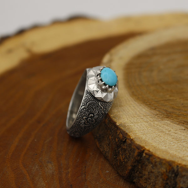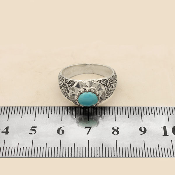 انگشتر فیروزه نیشابوری نقره مردانه دست ساز طرح قلم زنی درود