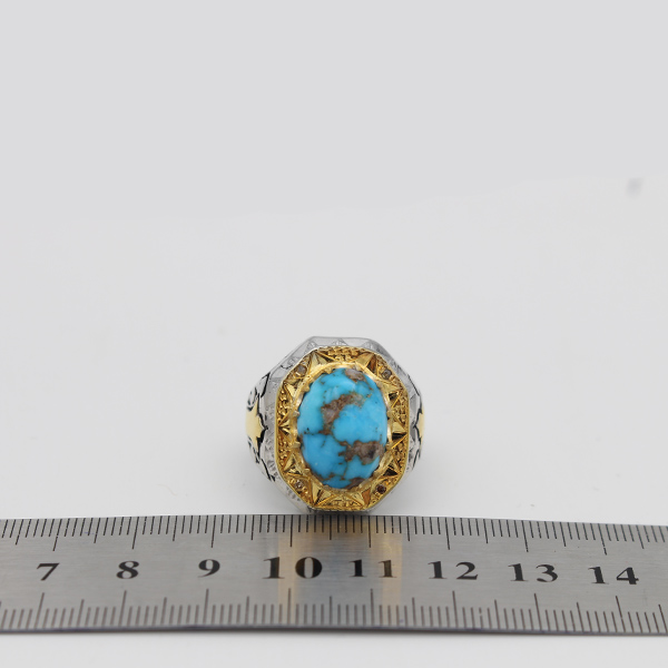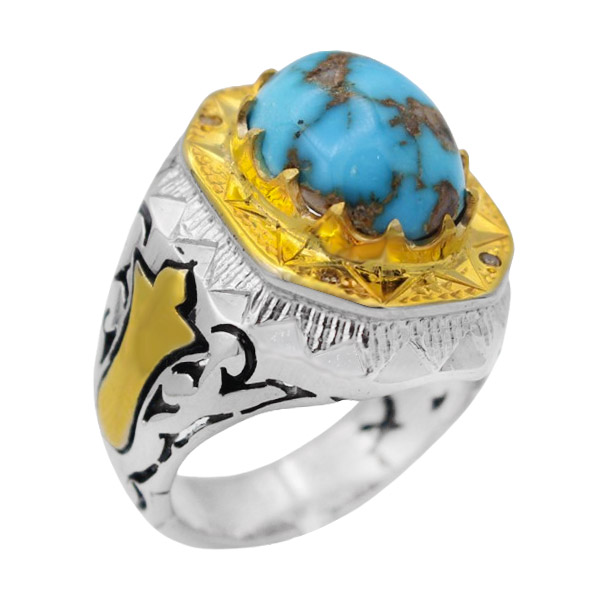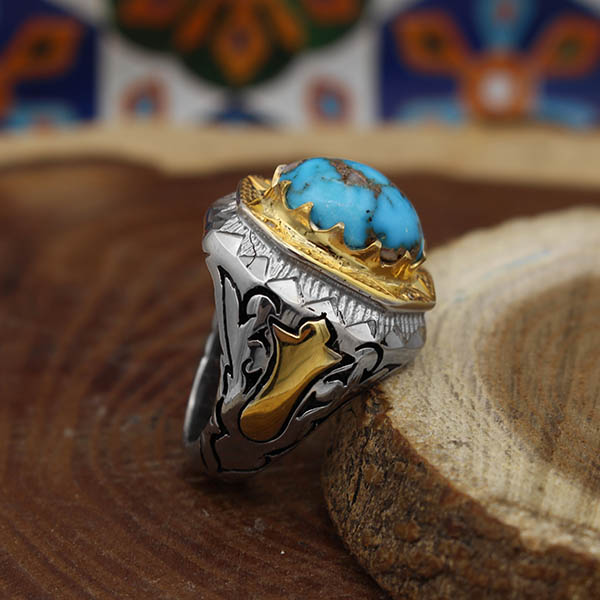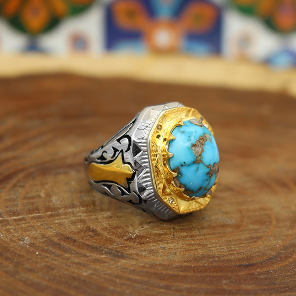 انگشتر فیروزه نیشابوری نقره مردانه دست ساز طرح عنایت + 4 قطعه برلیان