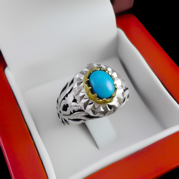 کیفیت ساخت این انگشتر بسیار بالا بوده و در ساخت آن از هنر شبکه زنی و آینه کاری استفاده شده است. این محصول ساخته دست هنرمندان این حرفه است. چنگ های طلایی رنگ انگشتر از جنس برنج بوده که با گذشت زمان تغییر رنگ نمی دهد. نگین انگشتر فیروزه نیشابوری اصل و معدنی می باشد. رنگ آبی زیبا نگین سبب جذابیت هرچه بیشتر انگشتر شده است. مزیت دیگر این نگین فیروزه پاک بودن آن (بدون رگه بودن آن) می باشد. جنس انگشتر از نقره با عیار ۹۲۵ بوده و قابلیت سایز شدن برای هر سایز انگشتی را دارد.
