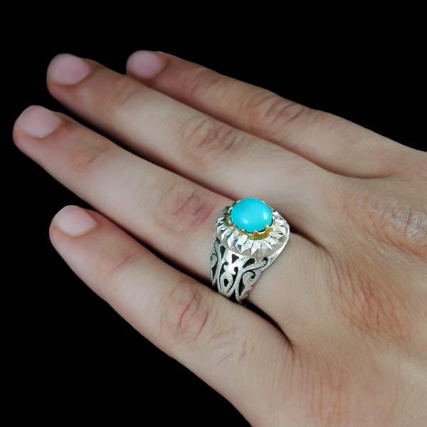 انگشتر نقره فیروزه نیشابوری دست ساز مردانه طرح دورطلایی فرنود
