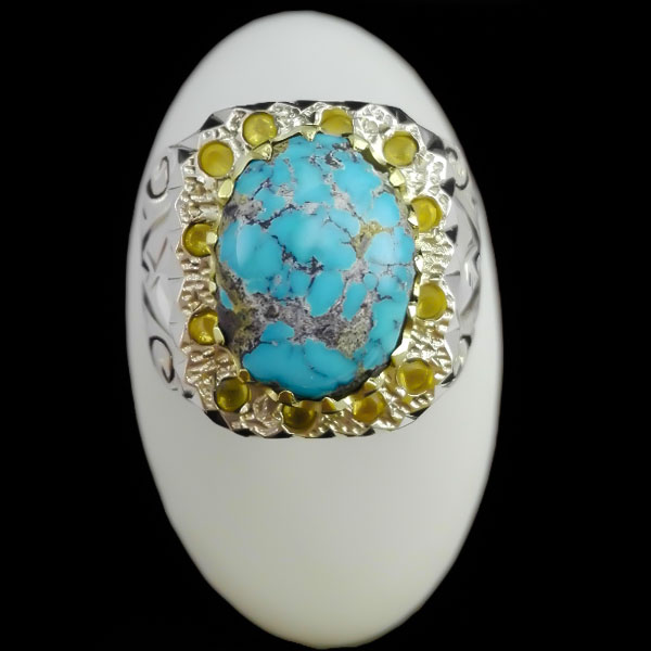 انگشتر فیروزه نیشابوری مردانه طرح هیوا از نقره ۹۲۵ عیار و توسط انگشتر سازان مجرب ساخته شده است طرح های آینه کاری و شبکه سازی بکار رفته با ظرافت و دقت زیاد کار شده و رنگ طلایی و طراحی منحصر به فرد چنگ خودنمایی میکند و به زیبایی و کیفیت محصول افزوده است. دور تا دور نگین با ۱۲ عدد سنگ یاقوت زرد معدنی تزئین شده و جلوه زیبایی به انگشتر بخشیده است. جنس نگین فیروزه نیشابوری درشت اصل و معدنی بوده که علاوه بر رنگ منحصر به فرد دارای رگه های جذاب و نقش های مختلف می باشد و خواص معنوی بسیاری دارد این انگشتر برای هر سایز انگشتی قابلیت سایز شدن را دارد