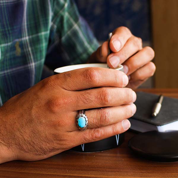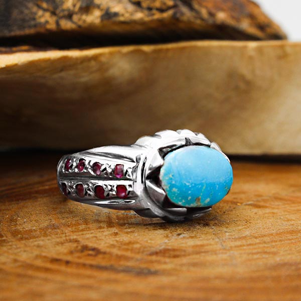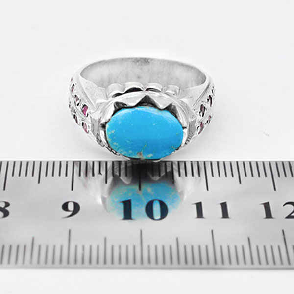 انگشتر فیروزه نیشابوری نقره مردانه دست ساز طرح منصور + ۱۶ قطعه یاقوت سرخ