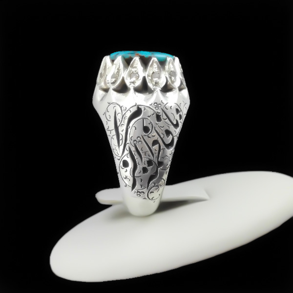 انگشتر فیروزه نیشابوری طرح یا امیرالمؤمنین از فاخرترین و خاص ترین محصولات فیروزه است. این انگشتر با نام مبارک بهترین زوج عالم با خطی خوش مزین شده و یک هدیه مناسب برای داماد می باشد. رکاب انگشتر از نقره ۹۲۵ عیار و توسط دست هنرمندان این حرفه ساخته شده است. حکاکی اذکار با خط خوش روی این رکاب بسیار هنر نادری است و تعداد کمی از هنرمندان کشورمان این توانایی را دارند. طرح های مخراج کاری و نگاره های رکاب با دقت و ظرافت بالا انجام شده و ذکر مبارک « یا امیرالمؤمنین » یک سمت رکاب و ذکر متبرک « یا فاطمه الزهرا » طرف دیگر رکاب با خط زیبا و به صورت هنری قلم زنی دستی شده است. طراحی خاص و منحصر به فرد چنگ های انگشتر خودنمایی می کند و روی آن ها با ۱۲ قطعه برلیان تزئین شده است که ارزش محصول را صدچندان کرده است. جنس نگین فیروزه نیشابوری اصل و معدنی بوده که علاوه بر رنگ جذاب دارای خواص معنوی بسیاری است و چند رگه روی سطح آن مشاهده می شود که به نقش و نگاره های محصول افزوده است. این انگشتر برای هر سایز انگشتی قابلیت سایز شدن را دارد.