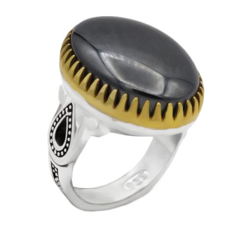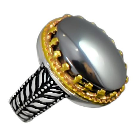 انگشتر حدید صینی مردانه طرح یا علی ابن موسی الرضا (ع) نسبت به اکثر انگشترها وزن بیشتری دارد و به روی آن نقش و نگاره های جذابی مشاهده می گردد و دارای طرح های سیاه قلم و پس زمینه مشکی یک دست و جذابی است و  که میان تمام این طرحها ذکر مبارک « یا علی ابن موسی الرضا (ع) » حک شده و زینت بخش محصول می باشد.  جنس رکاب این انگشتر از نقره ۹۲۵ عیار است و قسمت طلایی رنگ آن از برنج ساخته شده و تغییر رنگ نمی‌دهد و جلوه بسیاری را به محصول بخشیده است. جنس نگین سنگ حدید صینی اصل و معدنی است که خواص معنوی بسیار و رنگ مشکی و درخشنده ای دارد و از جانب امام صادق (ع) نیز توصیه شده است و خواص معنوی این سنگ با حکاکی اذکار متبرک و مختلف و مطابق آداب و به انتخاب شما افزوده می شود. این انگشتر قابلیت سایز شدن برای هر سایز انگشتی را دارد.