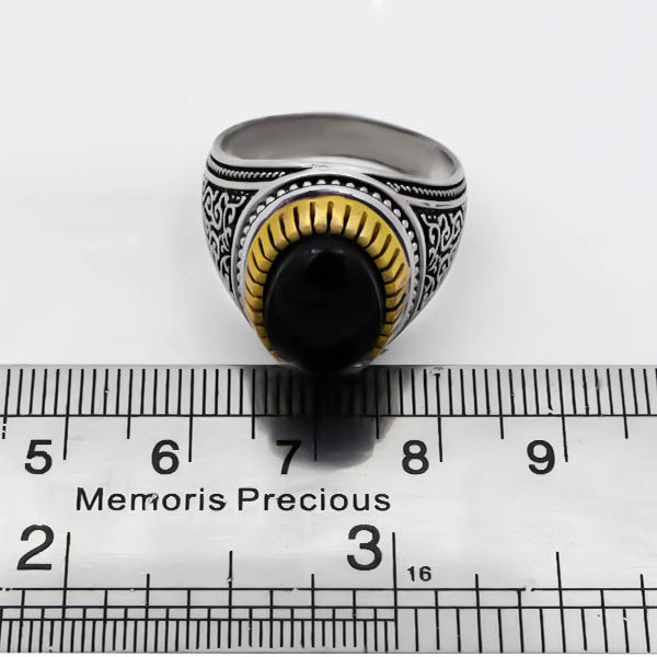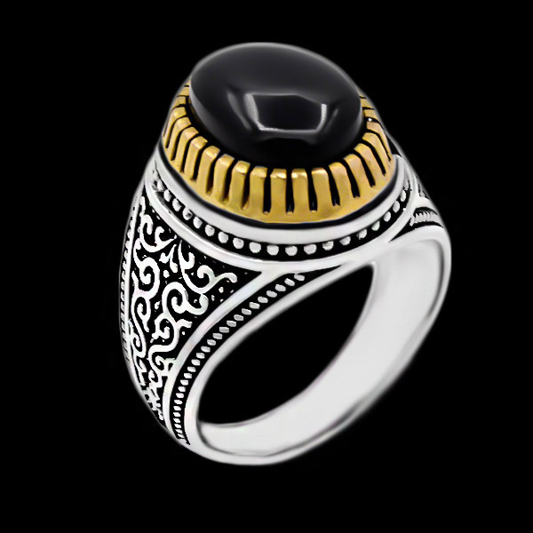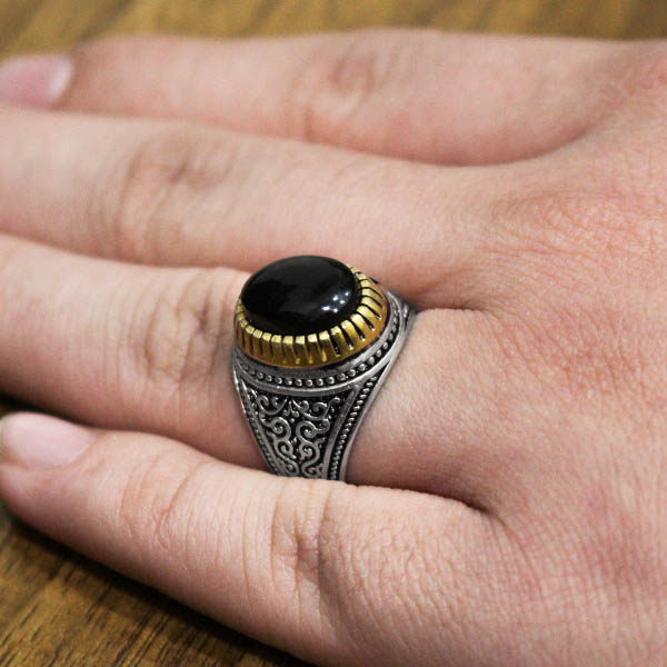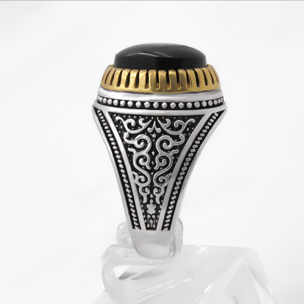 انگشتر عقیق مشکی نقره مردانه طرح دورطلایی زافر